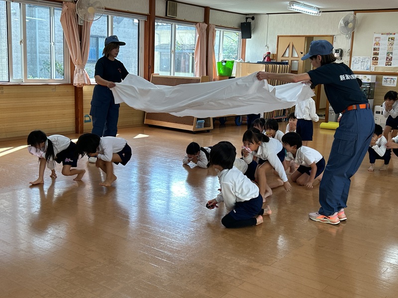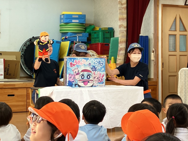 遊戯室にもどってからは、女性消防団の皆さんから、紙芝居を見せてもらい、火災の煙から避難する方法を教えていただきました。