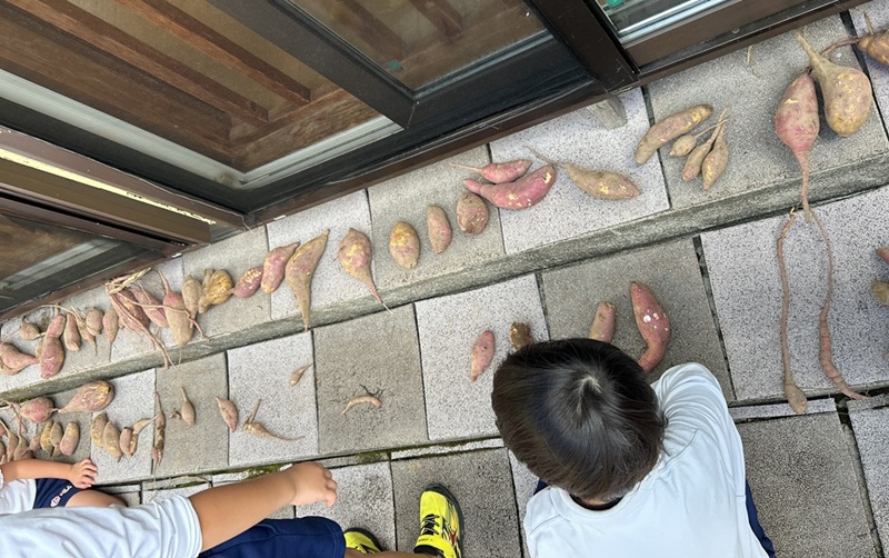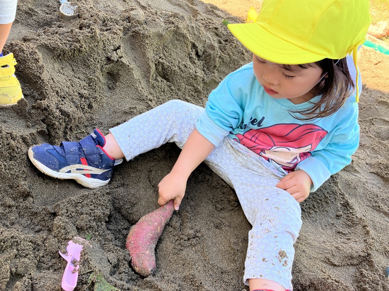 畑のサツマイモが掘りおこされた次の日。お砂場がさつまいも畑に変身!