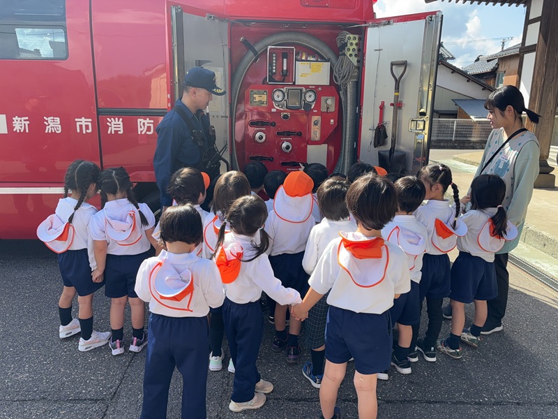 園庭に真っ赤な消防自動車が到着すると、窓に玄関に消防車にくぎ付けになる子どもたち。
