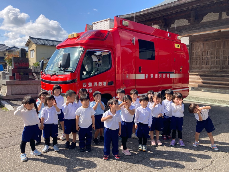 避難訓練の様子をたくさんの消防士さんに見守られ、「上手に避難できました!」と花丸をもらった子どもたち。